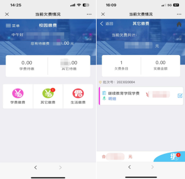第三步:登录后出现校园缴费界面,提示待缴款金额,点击有提示的“其他缴费”项目,进入其他缴费界面,显示当前欠费金额,可查看具体批次号和费用明细。