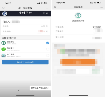 第四步:点击右下方的“缴”字,可进入支付平台(目前仅支持微信支付、农业银行和农行网银支付),确认支付即可。缴费后可自行下载电子发票。