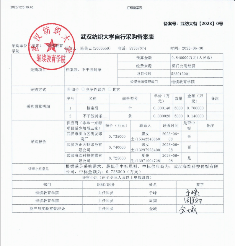 best365英国体育在线自行采购备案表(档案袋、不干胶封条)