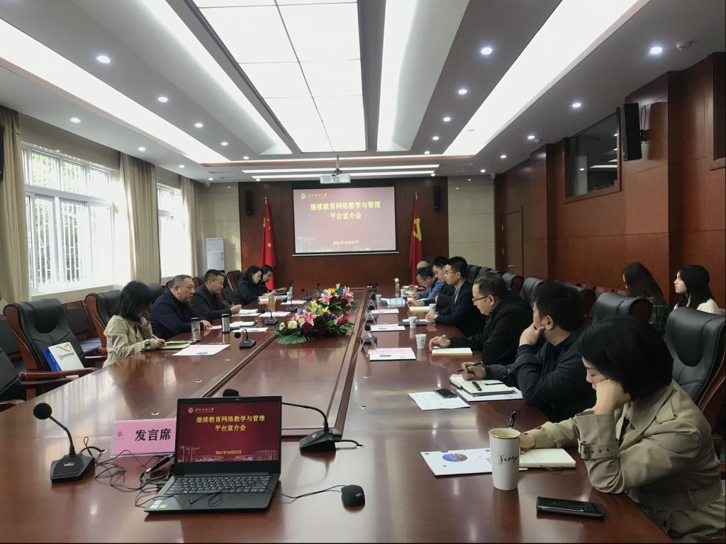 2021年10月27日,best365英国体育在线在南湖校区会议中心举办继续教育网络教学与管理平台宣介会,邀请武汉良师在线教育科技有限公司、武汉华莘教育科技有限公司两家公司对平台功能做介绍,长江科技专修公司和武汉大楚学堂教育咨询有限公司作为特邀嘉宾单位出席宣介会,best365英国体育在线全体职工参加。活动由best365英国体育在线书记丁谊主持。