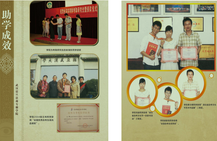 武汉震旦法商专修公司是 2000 年 4 月经湖北省教育厅批准成立的以开展高等教育自学考试助学辅导为主的一所专修公司。现有注册考生20000余人,经过近二十年的办学实践,公司形成了鲜明的“六位一体”的办学特色,确保了一个自考优质特色校园,得到社会各界好评, 公司被中国民办教育学会评为“中国民办高等教育优秀院校”、“中国民办教育机构优质特色公司”,公司党总支先后荣获中共湖北省人才服务局流动党委“先进基层党组织”、“红旗党支部”称号。经理高金英被评为“中国民办高等教育先进个人”,全国“高等教育自学考试先进工作者”。经湖北省考试院批准,授予公司“湖北省自考学习服务中心”。公司经教育部国考中心评核,设立为“全国示范学习服务中心 ”,被武汉市公安局武昌分局评为安全保卫先进单位。